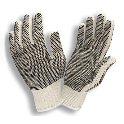 Breathable economy weight (7-gauge) Poly-Cotton knit gloves feature PVC dots on one side for a great grip and color-coded edging for sizing identity. Sold per dozen.