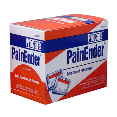 Pain Ender tablets relieve headaches, muscular aches and pains. Active ingredients: Acetaminophen, 110 mg.; Aspirin, 162 mg.; Salicylamide, 152 mg.; Caffeine, 32.4 mg.